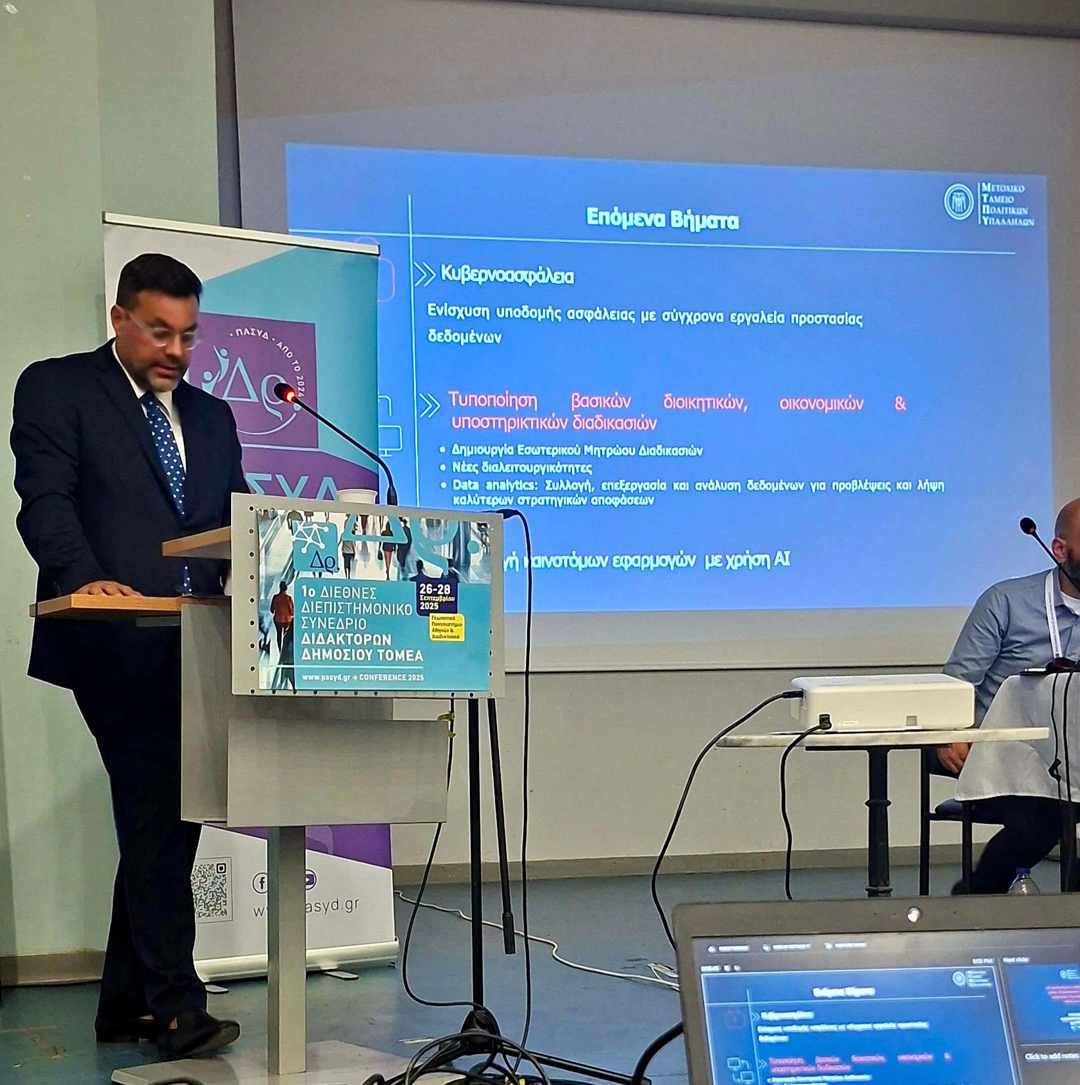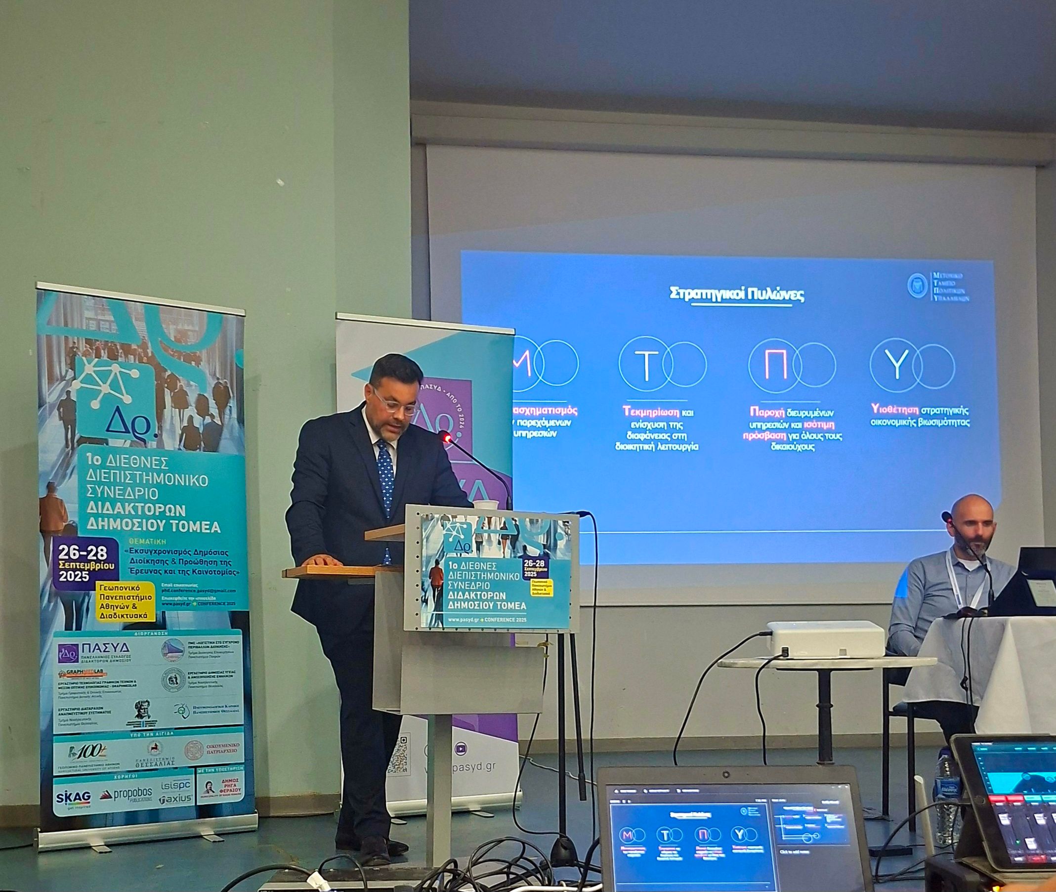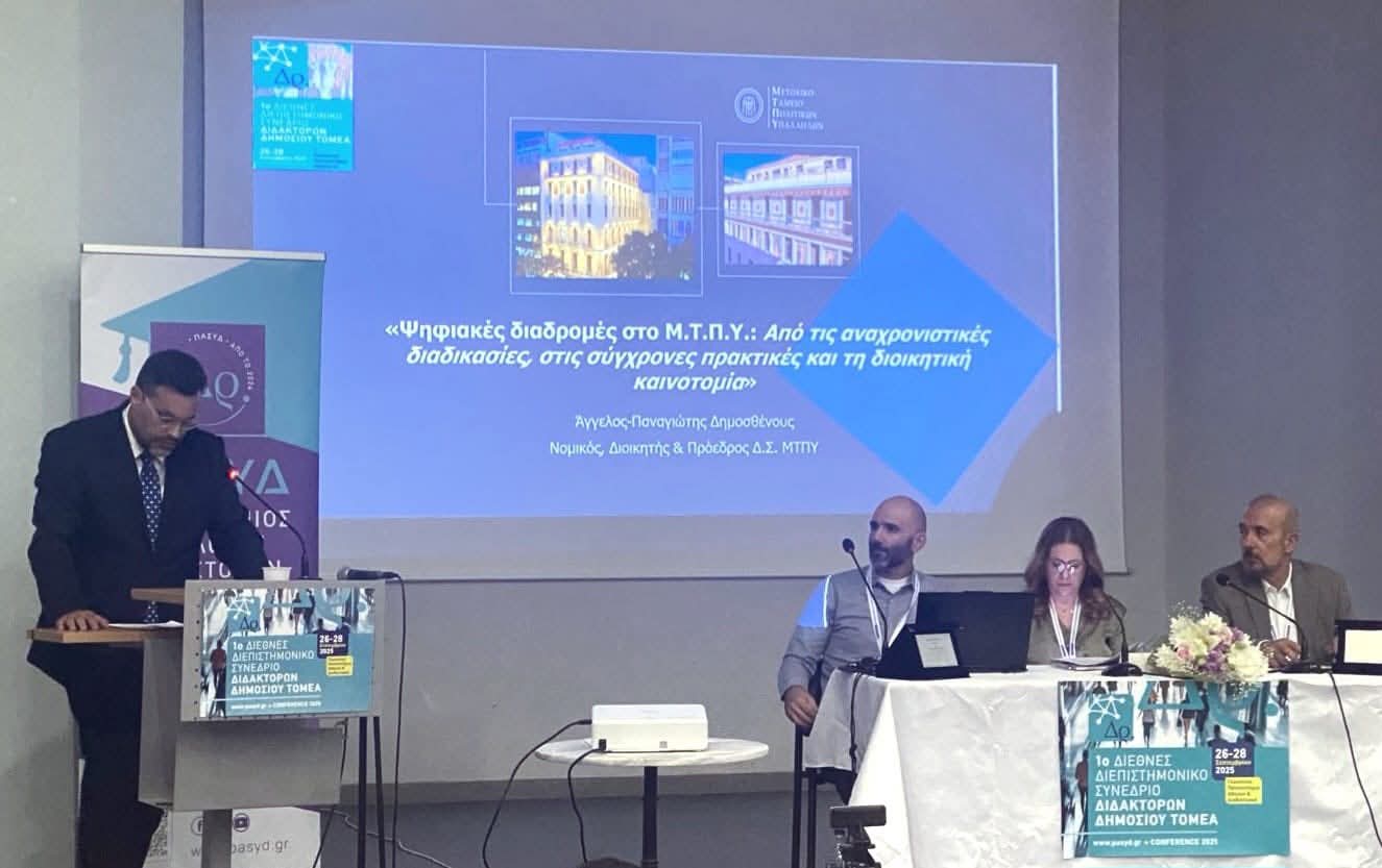 Mon, Sep 29 2025Ο Διοικητής και Πρόεδρος του Δ.Σ. του Μ.Τ.Π.Υ. κ. Άγγελος-Παναγιώτης Δημοσθένους παραβρέθηκε ως προσκεκλημένος ομιλητής στο 1ο Διεθνές Διεπιστημονικό Συνέδριο Διδακτόρων Δημοσίου Τομέα, το οποίο πραγματοποιήθηκε στις 26-28 Σεπτεμβρίου 2025 στο Γεωπονικό Πανεπιστήμιο Αθηνών.